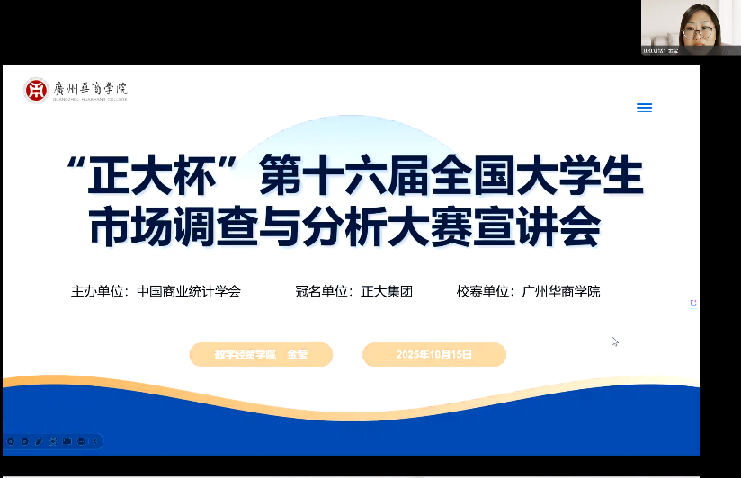 为激发全校学生创新实践热情,提升数据分析与市场调研能力,10月15日晚,广州华商学院数字经贸学院顺利举办了第十六届“正大杯”全国大学生市场调查与分析大赛宣讲会。本次宣讲会吸引了众多对市调大赛感兴趣的同学及老师们的参与,现场气氛热烈,互动频频。