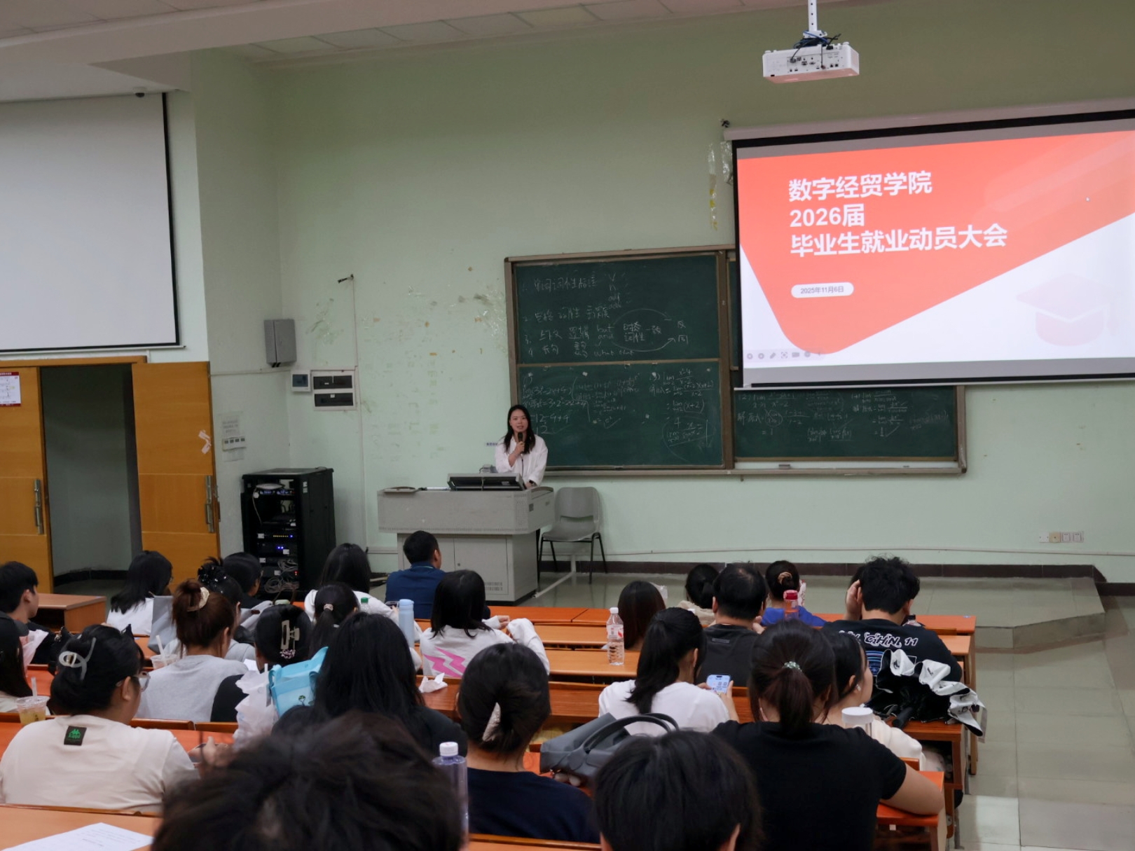 为保障2026届毕业生就业工作顺利开展,充分动员全体毕业生积极投身就业准备,树立正确的就业择业观,广州华商学院数字经贸学院于2025年11月6日18:15在励志楼C300和励志楼C407举行2026届就业暨毕业实习动员大会。数字经贸学院学工办主任李鑫老师、辅导员何涛老师、辅导员陈楚玲老师、各系主任及2026届全体毕业生们参加大会。会议由数字经贸学院辅导员陈楚玲和何涛主持。