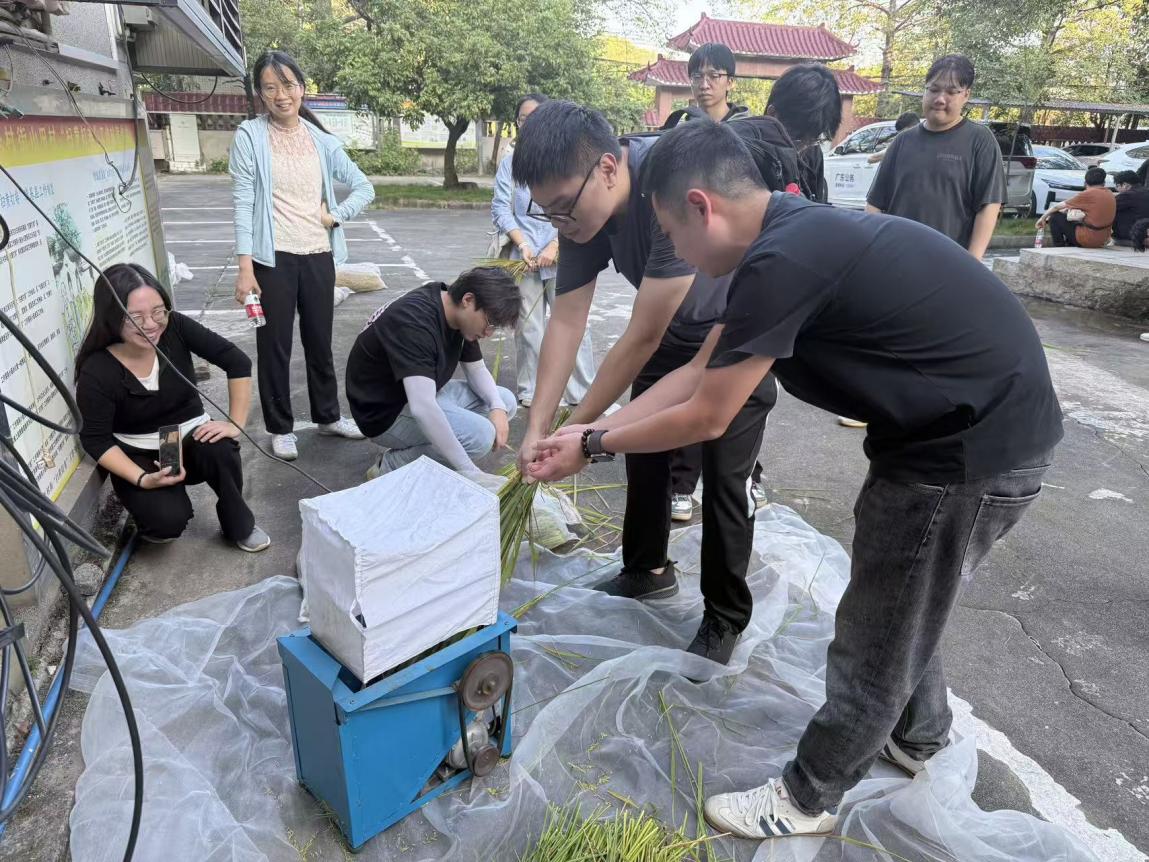 实地采样活动中,调查队工作人员讲解划定标准样本方区、精准收割固定面积稻谷、记录穗数与千粒重参数等规范流程。讲解结束后,学生们踏入稻田,在专业人员指导下分组开展实践,并收割后的稻谷运送至集中点进行脱粒称重。