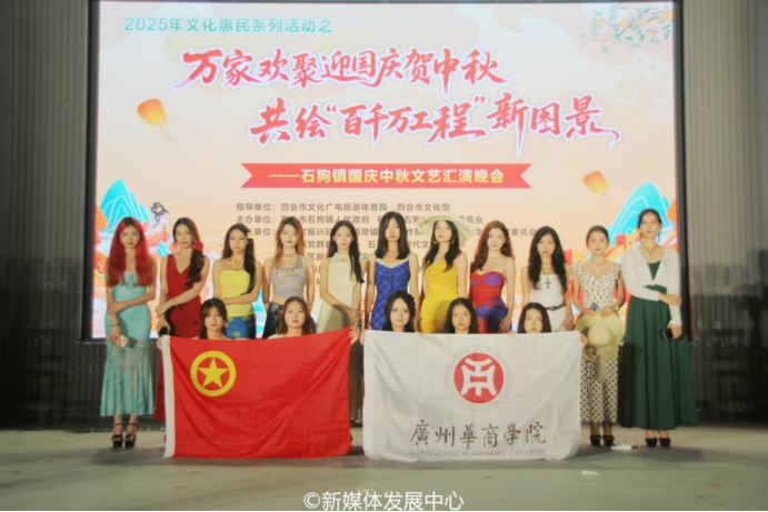 9月28日晚,由四会市文化广电旅游体育局、四会市文化馆指导,四会市石狗镇人民政府、石狗镇石狗社区居民委员会主办,共青团广州华商学院委员会协办的2025年文化惠民系列活动之“万家欢聚迎国庆贺中秋 共绘‘百千万工程’新图景”——石狗镇国庆中秋文艺汇演晚会在石狗镇文体广场热闹开演。我校团委组织20名志愿者协助出演舞蹈《什么是爱》及走秀《魅力石狗》。