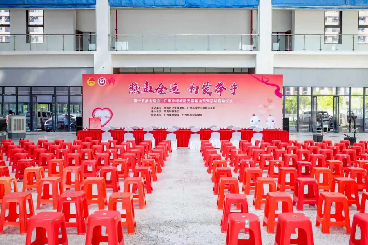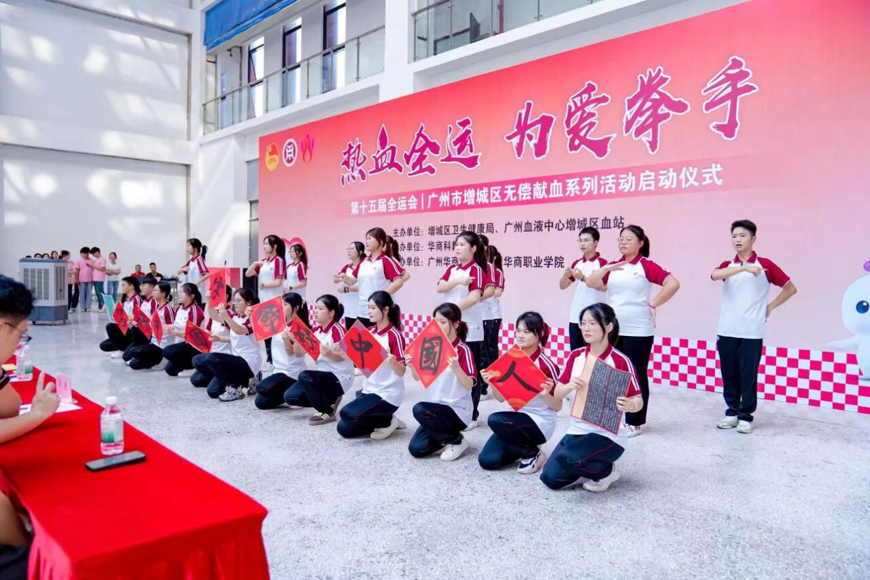 十五运会开幕在即,为推动全民健身与全民健康深度融合,弘扬奉献精神,普及无偿献血知识,10月14日下午,“热血全运 为爱举手”第十五届全运会广州增城区无偿献血系列活动启动仪式在广州校区创科楼一楼大厅举行。广州华商学院党委书记陈玉欢,广州华商职业学院校长助理、学校办公室主任袁晓斌,增城区卫生健康局医政科科长陆创杰,增城区血站站长杨雄彬、副站长黎艳梨,从化区血站站长温惠芹,广州华商学院团委书记陈刚、广州华商职业学院团委书记程璇以及两校十五运志愿者、师生代表200余人一齐参加本次活动。