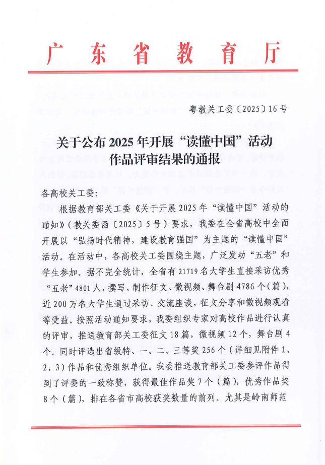 近日,广东省教育系统关工委发布《关于公布2025年开展“读懂中国”活动作品评审结果的通报》。