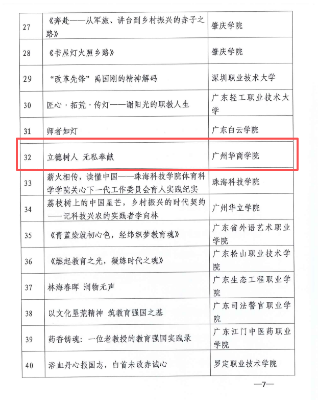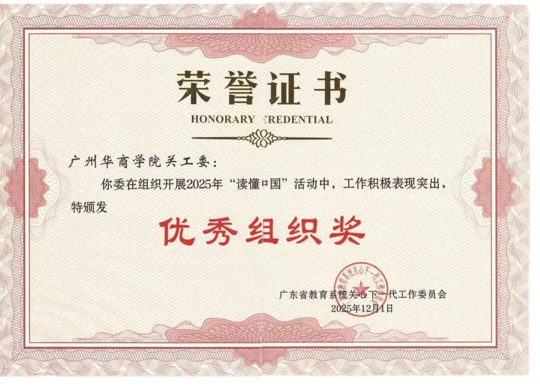 在2025年开展的“读懂中国”活动作品评审活动中,我校健康医学院24本药学1班学子吴东辉作品《立德树人 无私奉献》,荣获2025年“读懂中国”活动征文作品一等奖;广州华商学院关工委在2025年“读懂中国”活动中,荣获优秀组织奖。